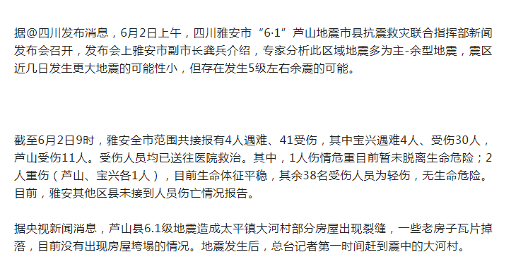 截至目前,四川雅安地震已造成4人遇難41人受傷